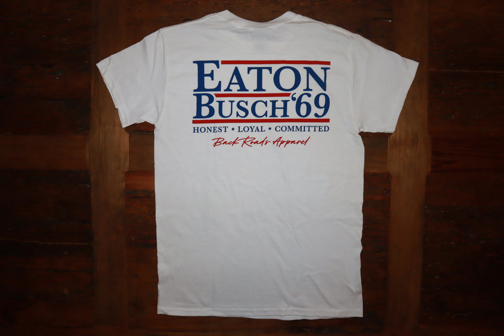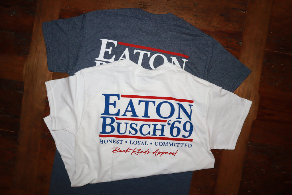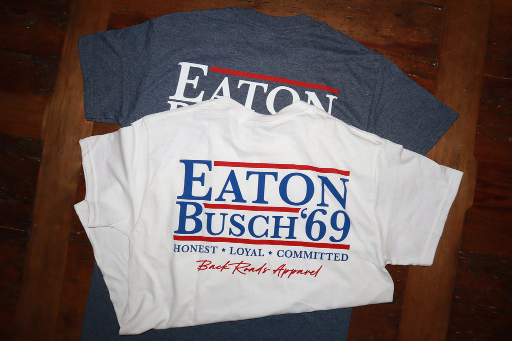 A campaign that deserves your support! Represent the Eaton Busch Administration! Eaton Busch design printed on the back. Back Roads Apparel logo on front left chest. White color option is a 100% cotton tee and Heather Navy is 50/50 blend.