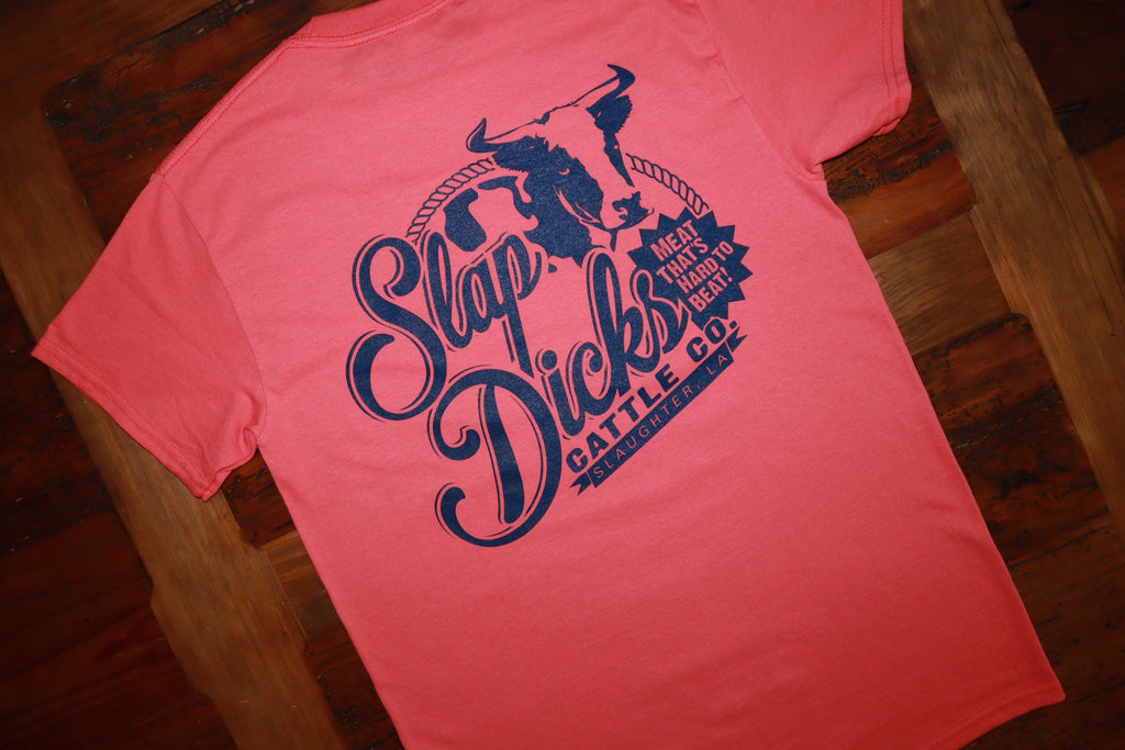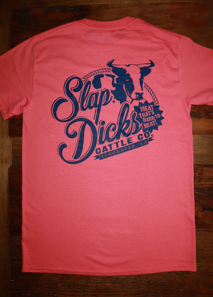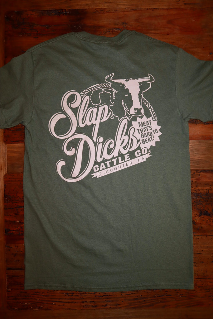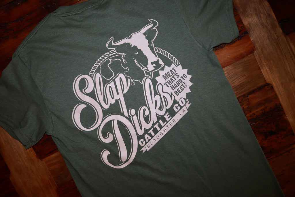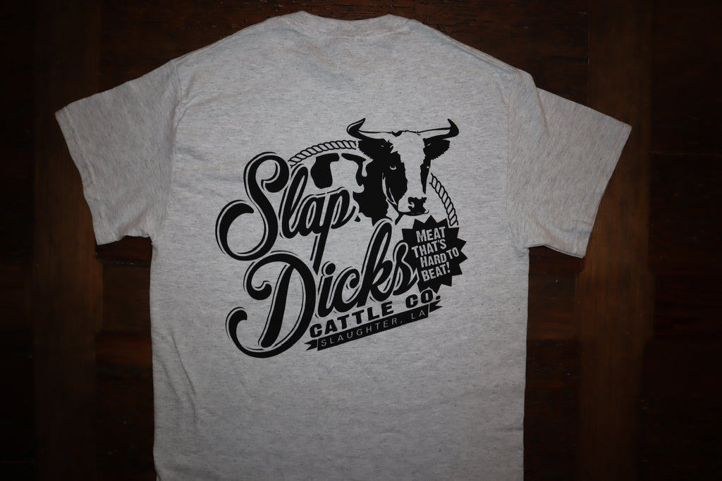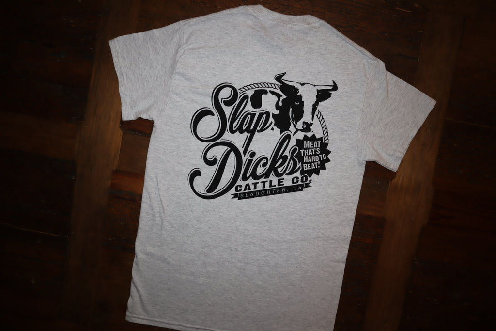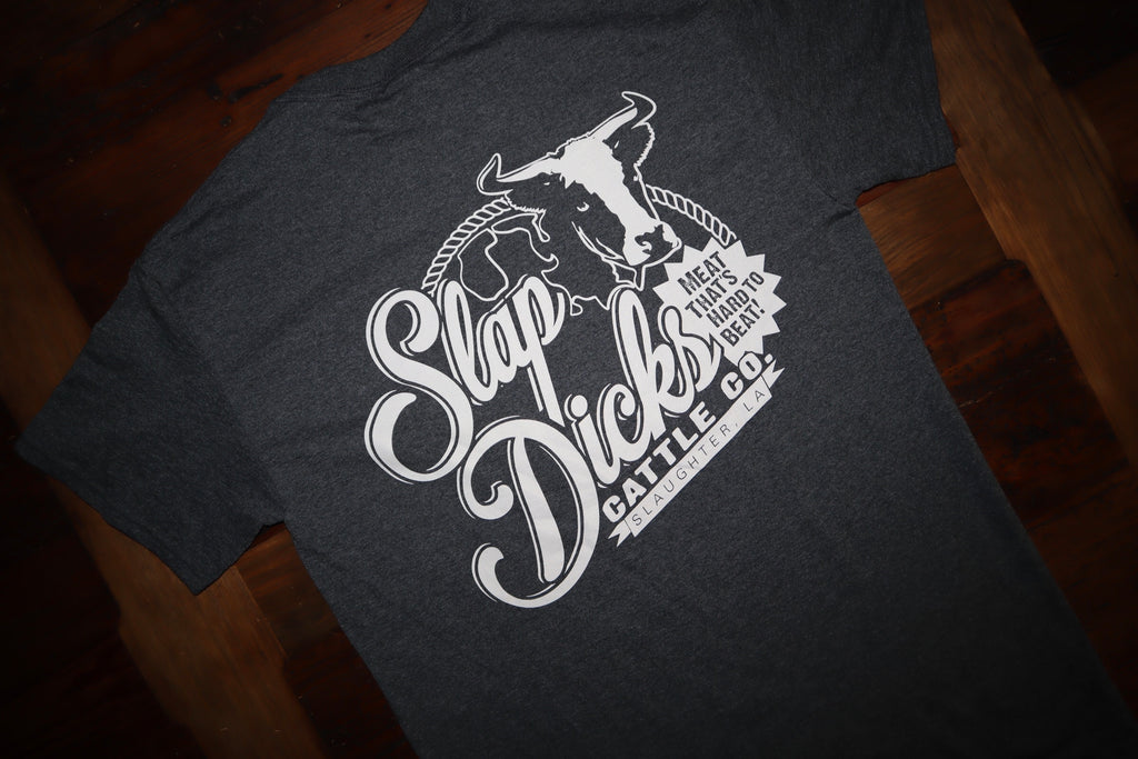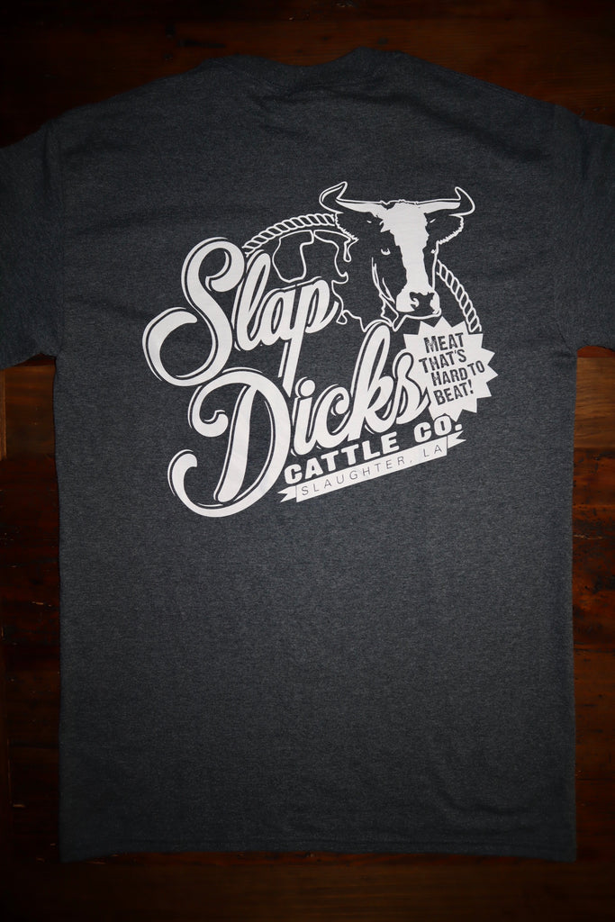 Slap Dicks Cattle Co has the Meat That's Hard To Beat™! This is our debut design for our cattle brand printed on the full back with our slap dicks font printed on the front left chest. T-shirt is a 100% cotton tee.