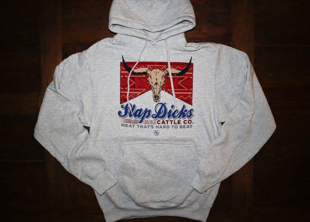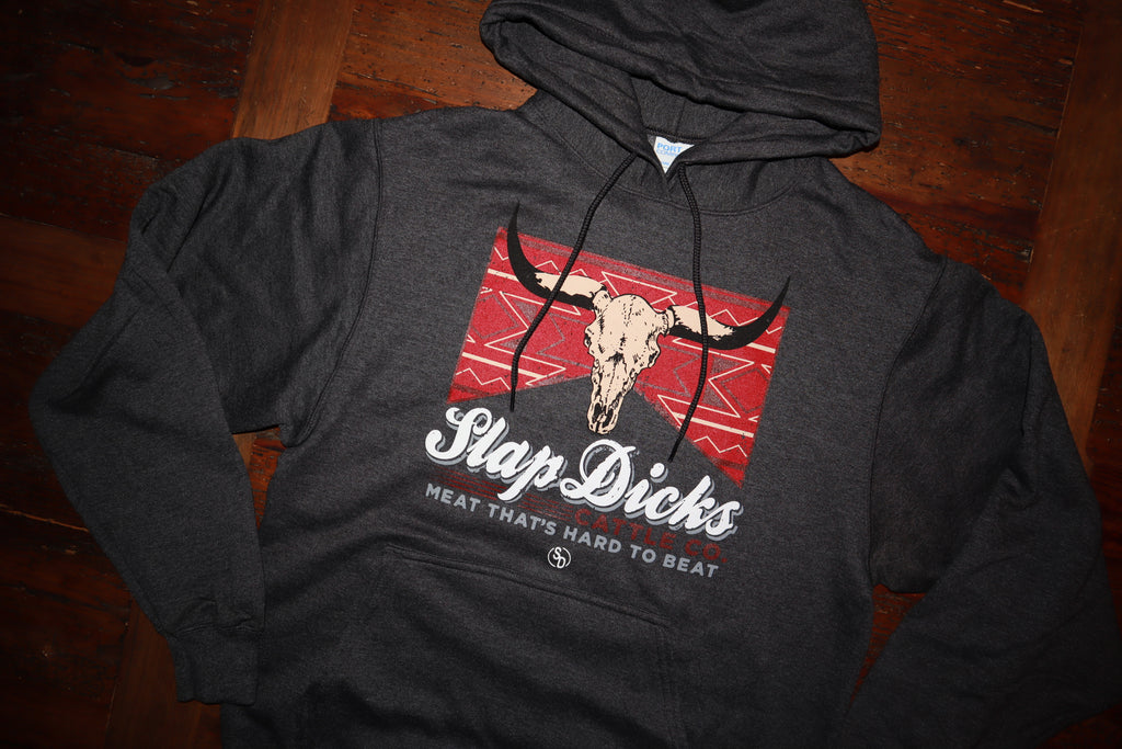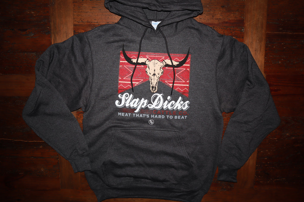 Slap Dicks Cattle Co. Banquet Bull design, which includes our infamous Meat That's Hard To Beat™ slogan, printed on the front of a 50/50 poly cotton fleece hoodie.