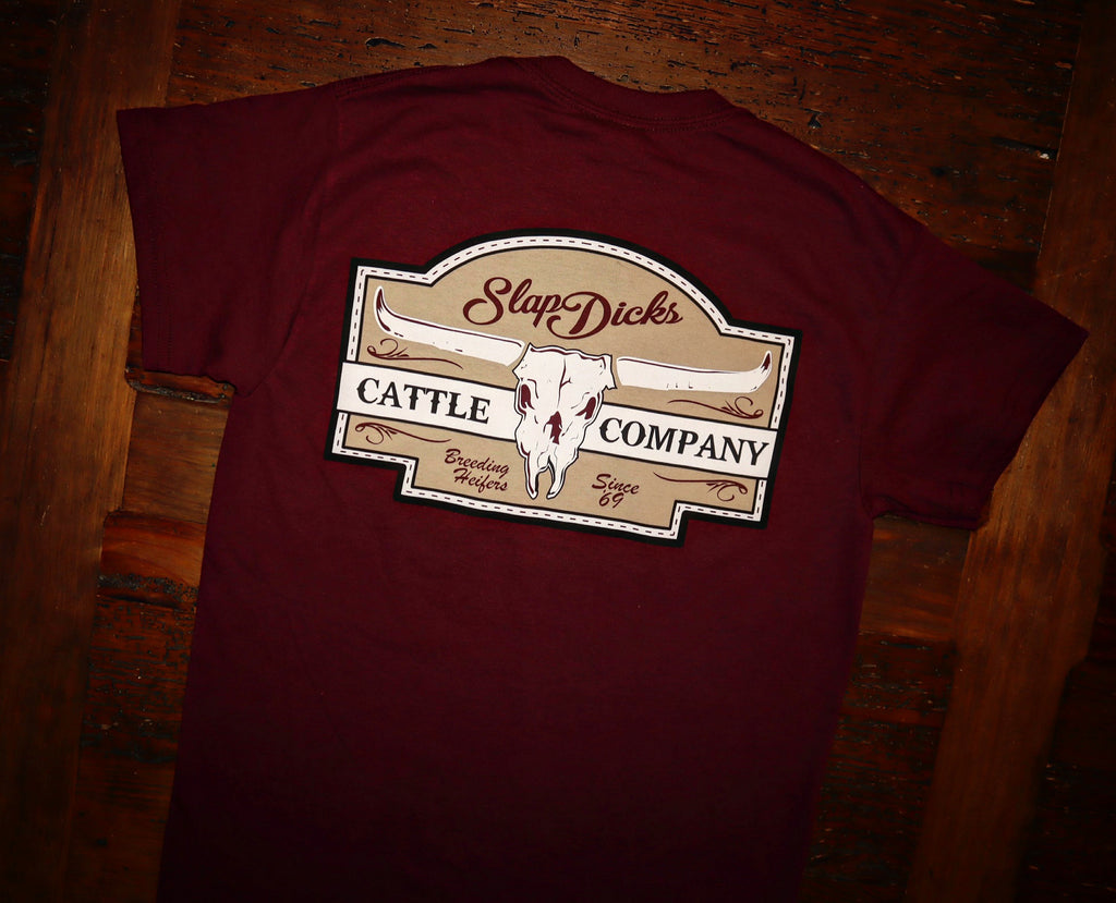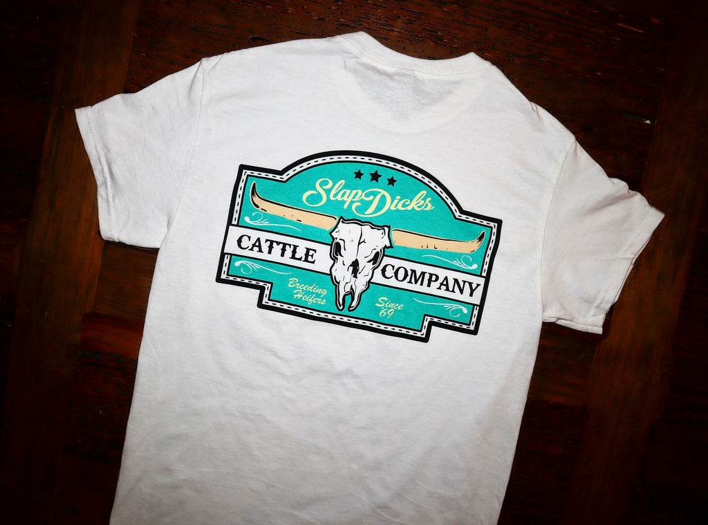 One of our staple designs for the Slap Dicks brand. The Troubadour design includes our trademarked and infamous Breeding Heifers Since '69 slogan. Printed the full back with our SD logo on the left chest. T-shirt is a 100% cotton tee.