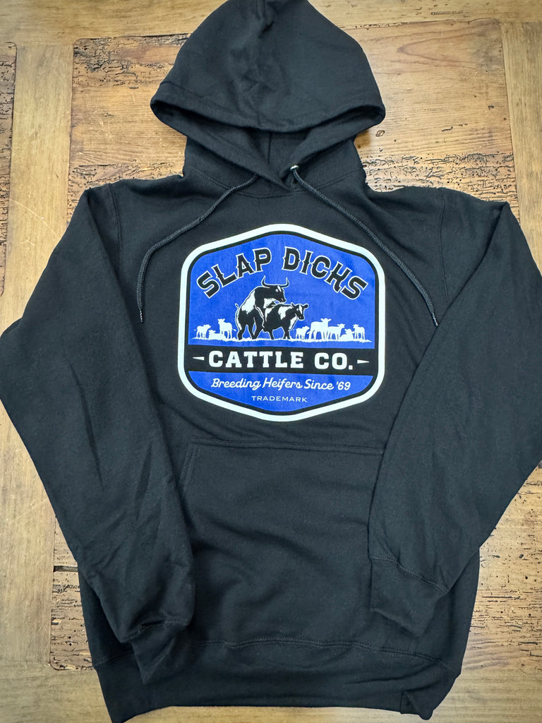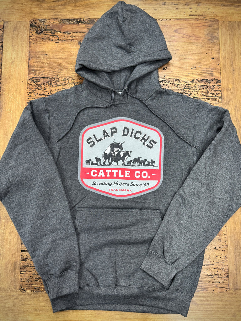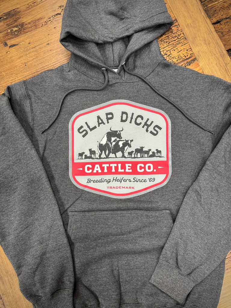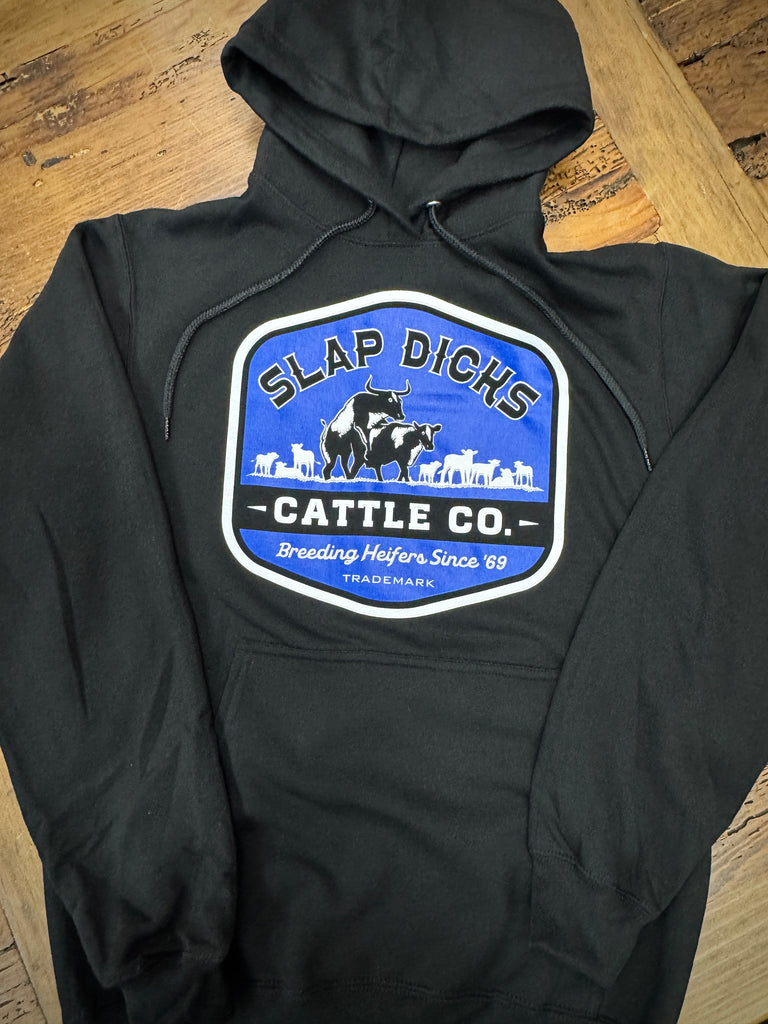 Slap Dicks Cattle Co. Calf Support design printed on the front of a 50/50 poly cotton fleece hoodie.